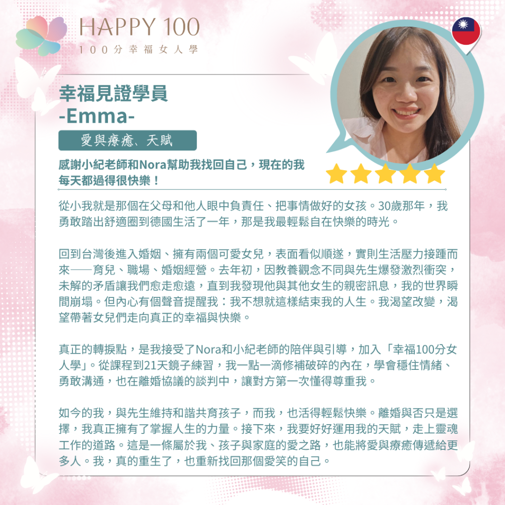 隨後,她踏上了《100分幸福女人學》的學習之路,從潛意識探索到溝通表達、天賦學習,一步步拆解原生家庭留下的負面內語與限制性信念。