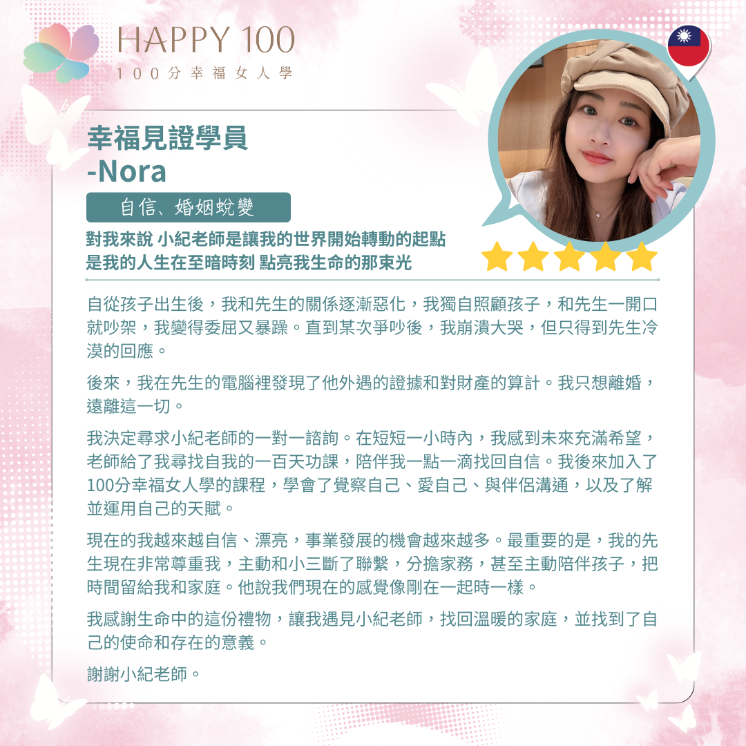 今天的 Nora,事業發展與感情生活都穩步向上。她明白,真正的幸福,是在愛別人的同時,不再委屈自己,並帶著自信走向每一天。